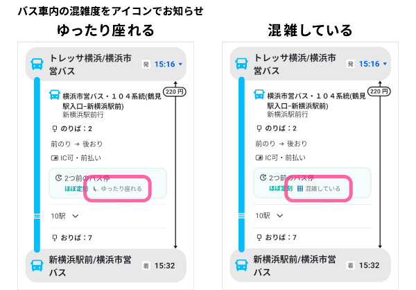 これにより、ユーザーは車内の混雑情報を一目で確認することができ、状況に応じて乗車するバスを選ぶことが可能です。