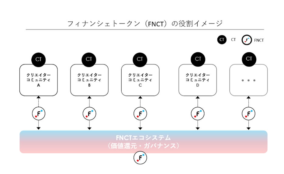 FNCTは、イーサリアムブロックチェーン上で発行される暗号資産です。FNCTは、FiNANCiEで発行されているコミュニティトークン同士を効果的に繋げられるようになり、コミュニティトークンの価値を長期的に向上させるためのプラットフォームトークンとしての役割を担います。具体的には、FiNANCiEのユーザーに報酬として付与されたり、FiNANCiE上の優良なコミュニティが継続的に成長するためのインセンティブとして活用されたりすることを想定しています。