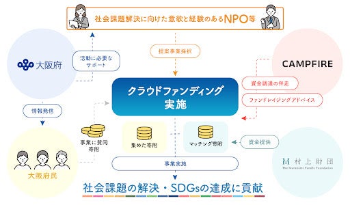 この事業は、「誰一人取り残さない」というSDGsの理念を踏まえ、SDGsの達成に貢献する様々な社会的な課題に対し、行政にはない着眼点を持つNPOの皆さんの活動に大阪府が支援を行いながら、ともに解決を図る取組です。この取組では、社会課題解決に取り組むNPOの皆さんに事業費をクラウドファンディングで集めていただき、集めた寄附額と同額を村上財団から寄附していただきます。従来の行政の支援とは異なる新たな公民連携の仕組みとなっています。また、事業終了後も活動を継続いただけるよう、効果的な資金調達のノウハウを獲得いただくため、クラウドファンディングのサポートも実施します。NPOの皆さん、多くのご応募お待ちしております。