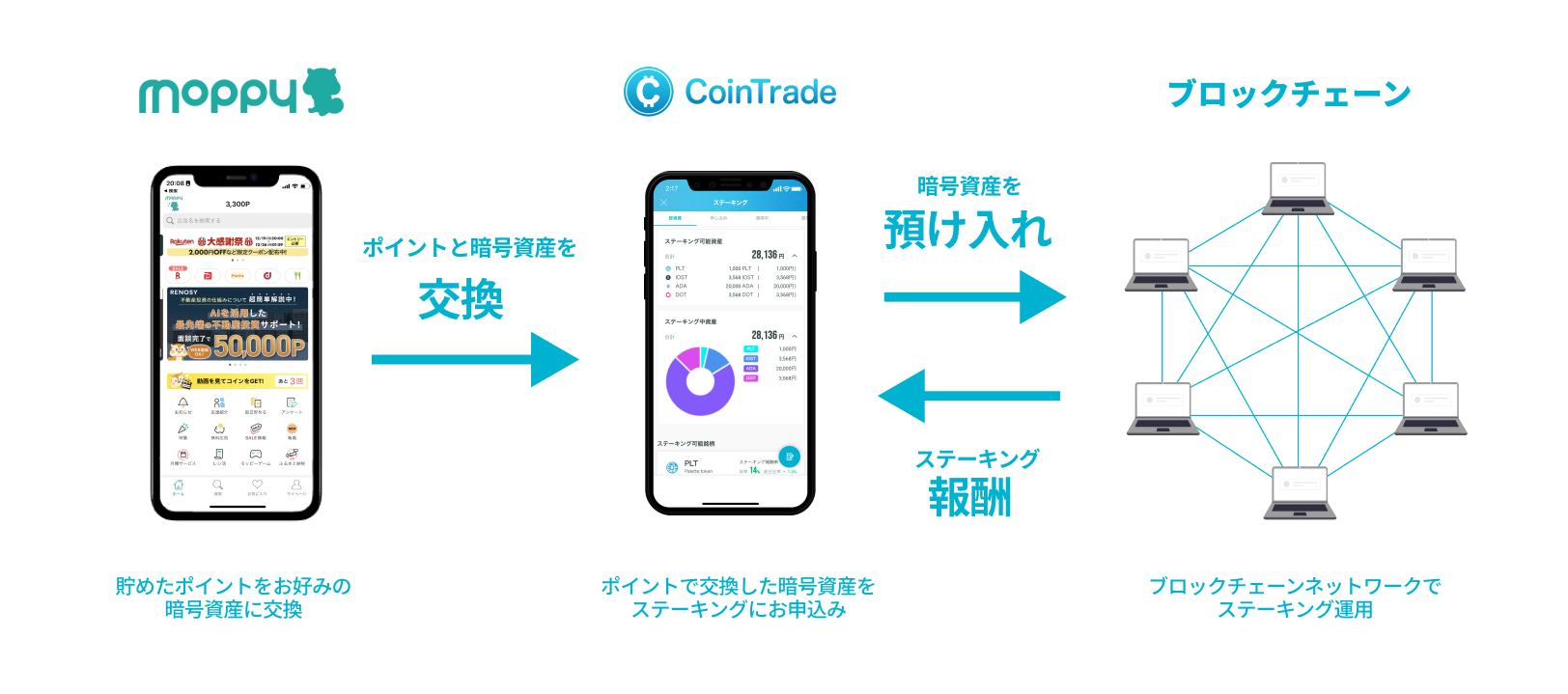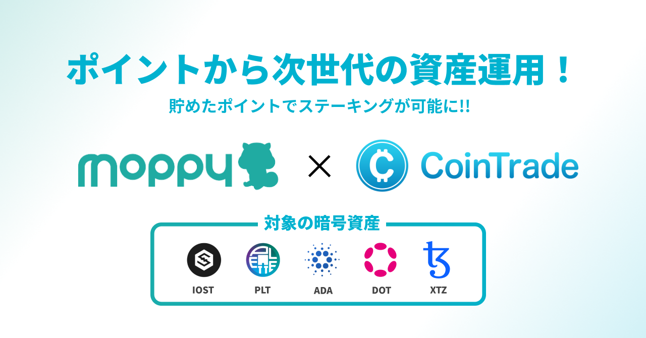 モッピーポイントと暗号資産の交換は、1モッピーポイントを1円として、500ポイントから暗号資産に交換が可能となります。既に交換対応可能なビットコイン(BTC)、イーサリアム(ETH)、リップル(XRP)、ライトコイン(LTC)、ビットコインキャッシュ(BCH)に次いで本年度に新たに取扱い開始した5銘柄の、パレットトークン(PLT)、アイオーエスティー(IOST)、カルダノ(ADA)、ポルカドット(DOT)、テゾス(XTZ)との交換が可能となります。