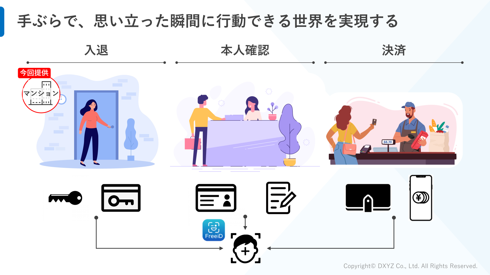 DXYZでは、国内初の「オール顔認証マンション※」を2021年1月に竣工して以降、全国でマンションへの顔認証導入を進めています。今回、新日本建物の資産運用型マンション「ルネサンス西麻布プレミアムコート」の共有エントランス、メール・宅配ボックス、ゴミ捨て場、ペット足洗い場、住戸扉にFreeiDを導入頂き、入居者は鍵を持たずに手ぶらで生活できる新たな暮らしを実現しました。