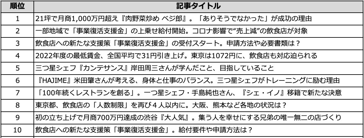 続いてTOP10を見てみると、2位、3位、8位、10位は事業復活支援金やコロナ禍での来店客の人数制限などコロナ関連の記事がランクインする結果に。20位〜11位同様に、コロナ関連の制度について関心が高かったことが窺えます。
