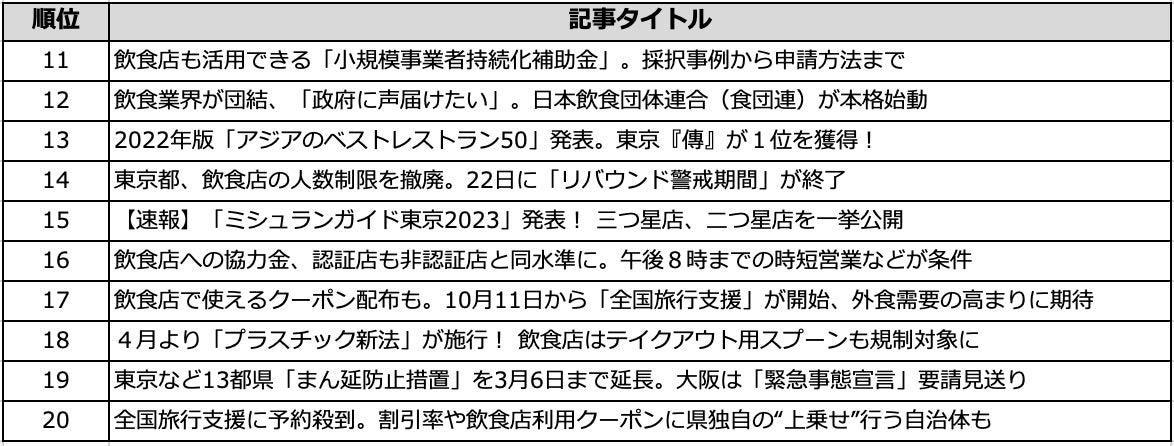このように、TOP20の記事のうち約半数はコロナ・アフターコロナ関連の記事が占める結果となりましたが、それ以外はコロナ禍でも成功している飲食店やアワードの発表など、前向きな記事に注目が集まりました。