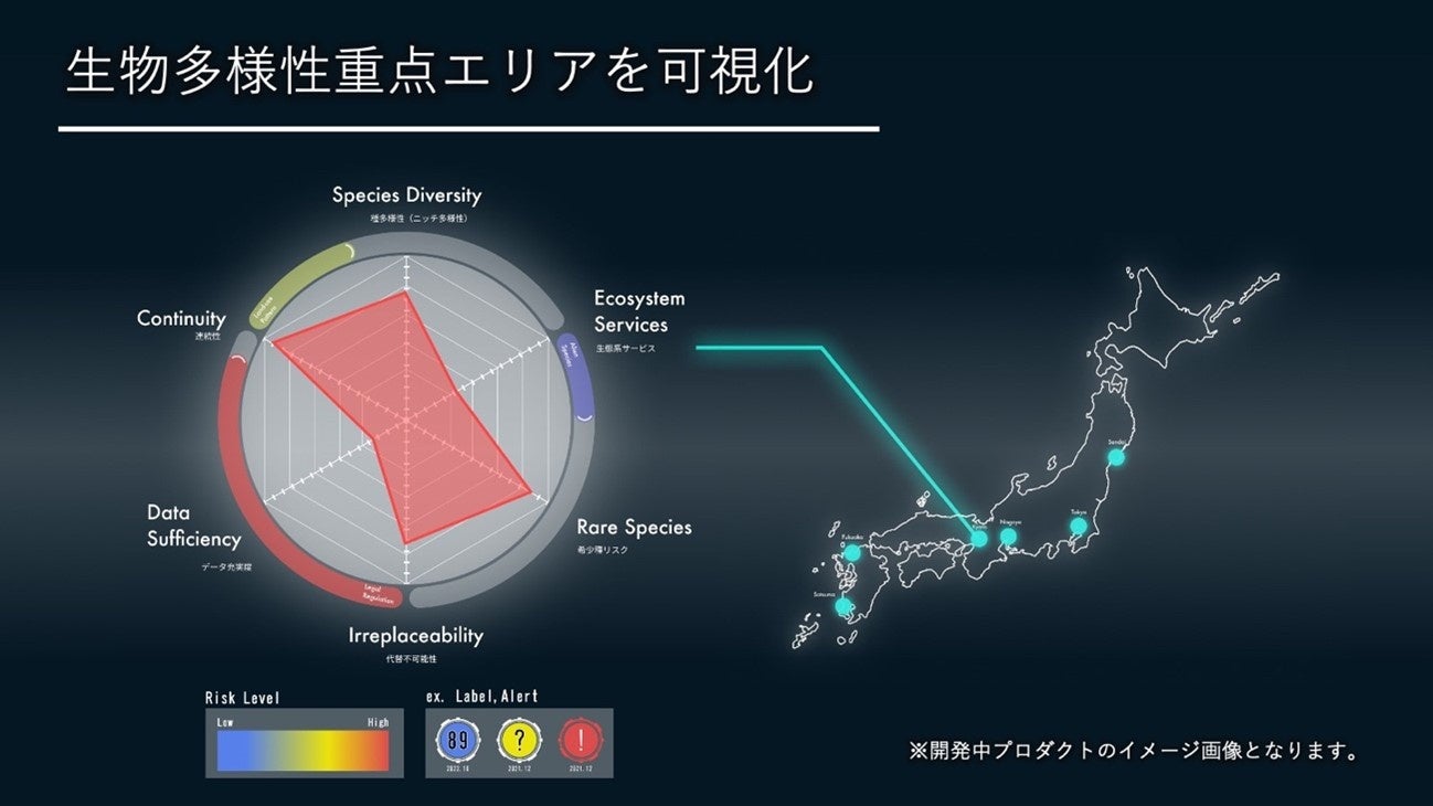 公開予定の本サービスは、事業活動における生物多様性重点エリアの特定、及びエリア特定後の詳細な調査の2つをサポートするツールを備えます。