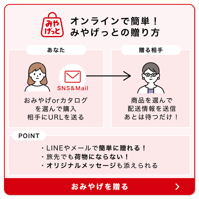 「みやげっと」は、SNSやメール・無料通話アプリにより、オンラインでお土産の贈答が簡単に行えるサービスです。購入から贈答までがスマートフォンひとつで完結する為、サイズの大きな農作物や冷凍品などのかさ張る商品も、旅先のお土産として気兼ねなくご購入頂けるようになります。また、商品の受け取り画面に動画や写真、メッセージを添えれば、旅先の魅力が伝わる世界に一つのオリジナルギフトが完成します。