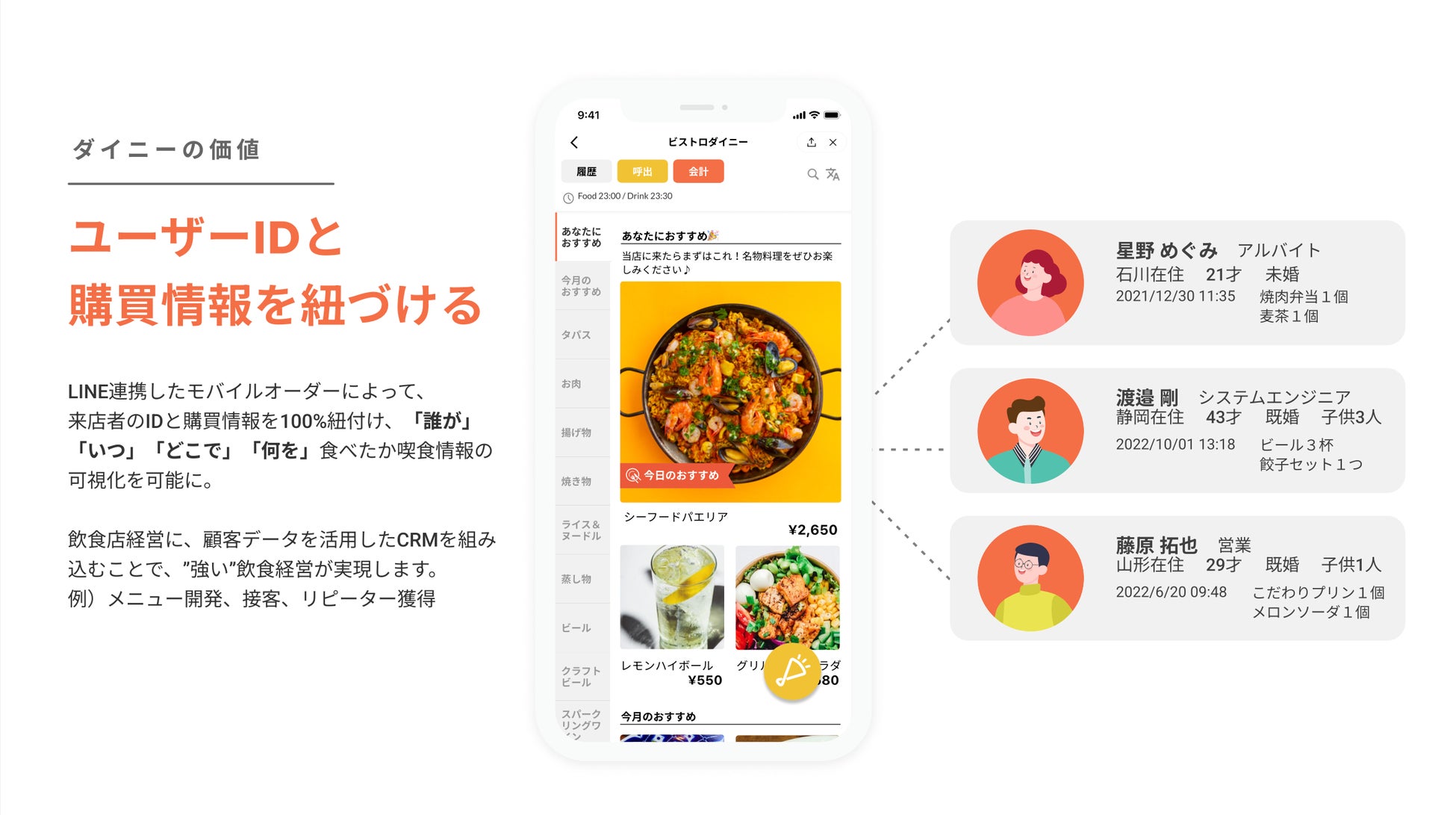 モバイルオーダーとPOSレジを一気通貫して開発を行うことで、「誰が」「いつ」「何を」食べているか、喫食情報がわかるID-POSを実現し、
