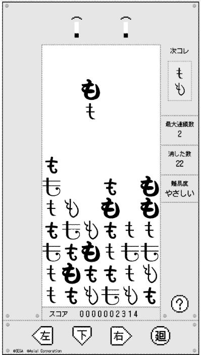 「ぷよぷよ」の基本ルールはそのままに、上から落ちてくる「も」を回転・横移動・高速落下させながら落とし、連結させて消していくパズルゲームです。文字を消すと、その書体名が表示されます。ゲームの難易度は「かんたん」「ふつう」「げきむず」「零 –ZERO–」の4段階。ゲーム終了後は難易度ごとにランキングを開示しています。