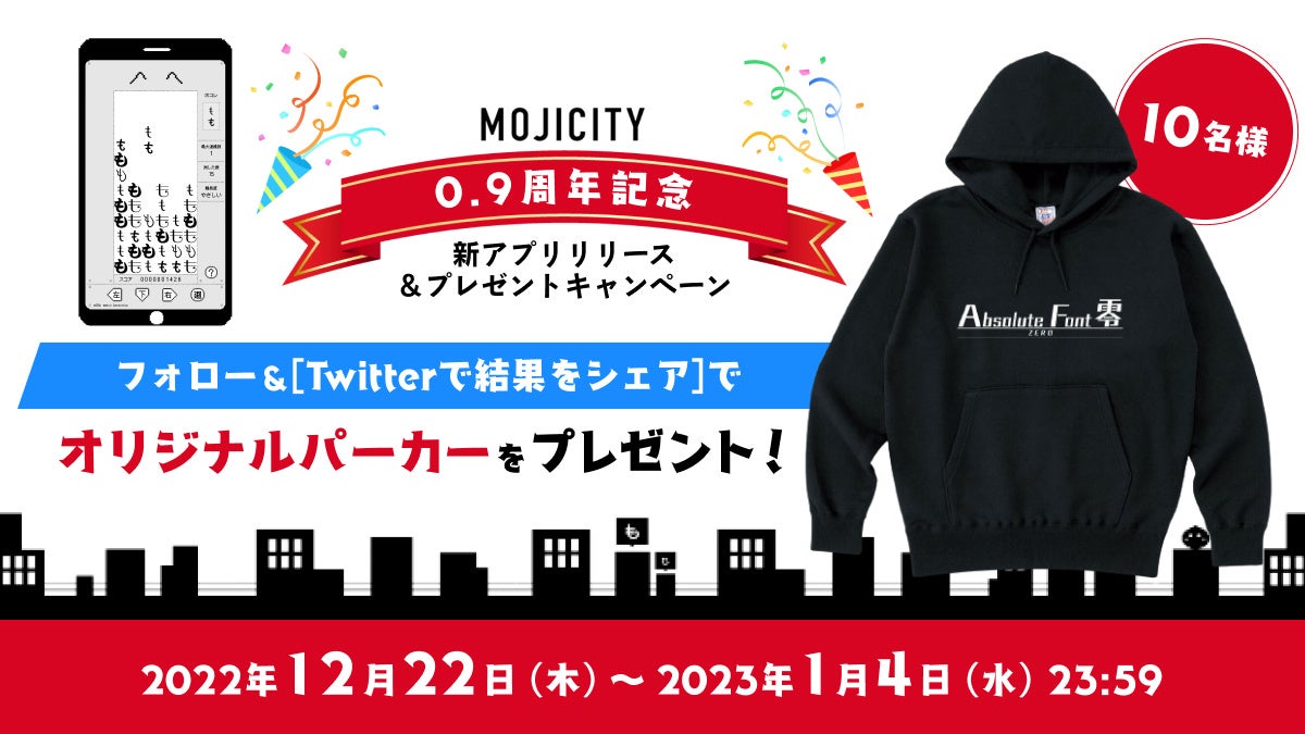 応募方法:MOJICITYなかのひと Twitterアカウント(https://twitter.com/mojicity_nknht)をフォローして、『Absolute Font 零 -ZERO-』をお楽しみください。ゲーム終了後の[Twitterで結果をシェアする]ボタンを押してTwitterに投稿してください。