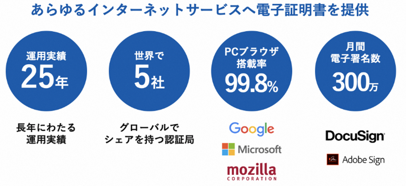 GMOグローバルサイン・HDは、11万社の法人のサーバー運用実績、国内販売代理店 約6,800社の販売代理店を有するホスティング事業者であり、グローバルでシェアを持つ世界トップ5社(※1)の中で唯一の国産認証局「GlobalSign」を保有する老舗IT企業です。政府関連機関・大手企業をはじめ世界各国の企業・団体に電子証明書を導入しています。