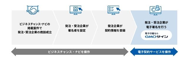 「ビジネスチャンス・ナビ」上に案件を掲載した発注企業と、エントリーを行った受注企業との契約締結において、電子契約サービス「電子印鑑GMOサイン」を利用することができます。