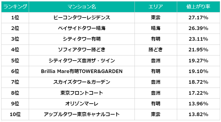 調査の結果、最も値上がり率が高かったのは、東雲のビーコンタワーレジデンスであり、2021年12月対比で27.17%値上がりしていることがわかりました。