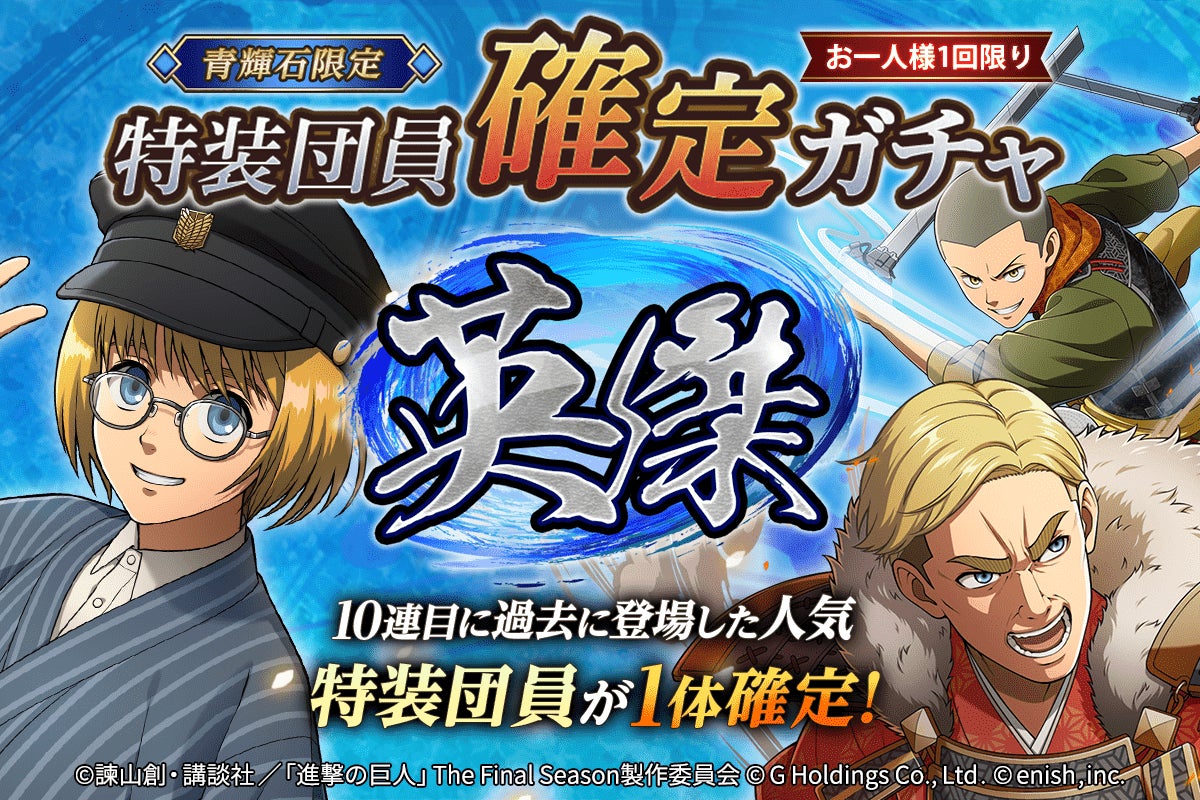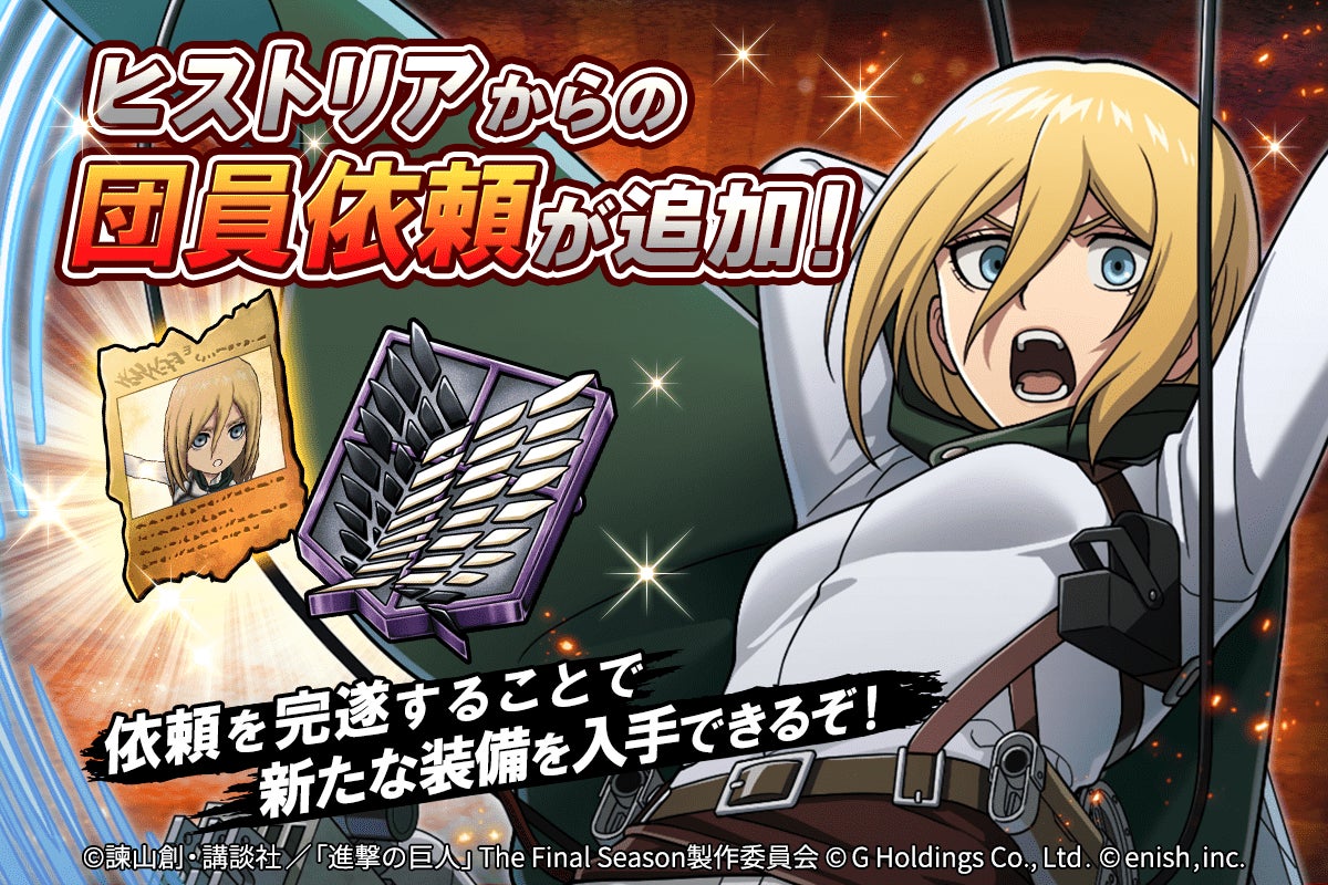株式会社enish(本社:東京都港区、代表取締役社長:安徳 孝平、以下enish)は、アニメ『進撃の巨人』のスマートフォンゲーム最新作「進撃の巨人Brave Order」にて、危険区域に新たな脅威が追加!団員からの依頼書にヒストリアの依頼のコンテンツを追加いたしました。新たな高難易度クエストであなたは人類に成果をもたらすことができるのか!?また、本日よりおひとり様各1回限り「【浪漫散歩】アルミン・アルレルト」等の過去に登場した特装団員が1体確定「【青輝石限定】特装団員 確定ガチャ 【英傑】と【豪傑】」を開催!更に、6月26日(日)19:30からゲストにアニ役の嶋村侑さんが出演する、公式生放送「ブレオダ通信」第3回を配信!その他、最新情報はゲーム公式サイト・ゲーム公式Twitterアカウントにて随時公開して行きますので、ぜひご覧ください。