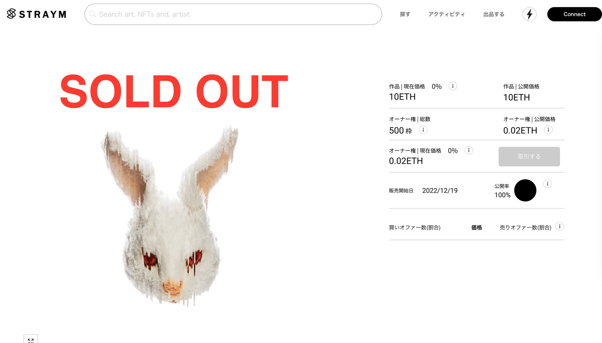 そしてプレセールの段階で、多くの買付が入り代表作「The First Mask Red」のオーナー権NFTが完売し、NFTプロジェクトでは異例のスピードで10ETH売り上げたことになります。