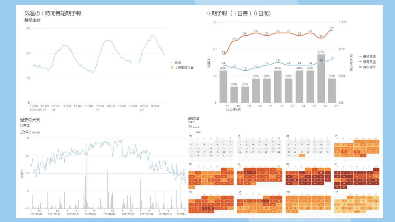 ウェザーニューズの気象データとの連携が可能なコネクターにより、Domoを導入している企業は、天気、気温、降水量、気圧、風速、相対湿度など、指定した場所の “1kmメッシュ(1km四方)”のピンポイントな気象情報を取得できるようになります。短期予報は 72 時間先までの 1 時間おきの天気予報、中期予報は 10 日先までの 1 日ごとの天気予報が含まれ、過去の気象データも1kmメッシュのピンポイントな情報を取得できます。