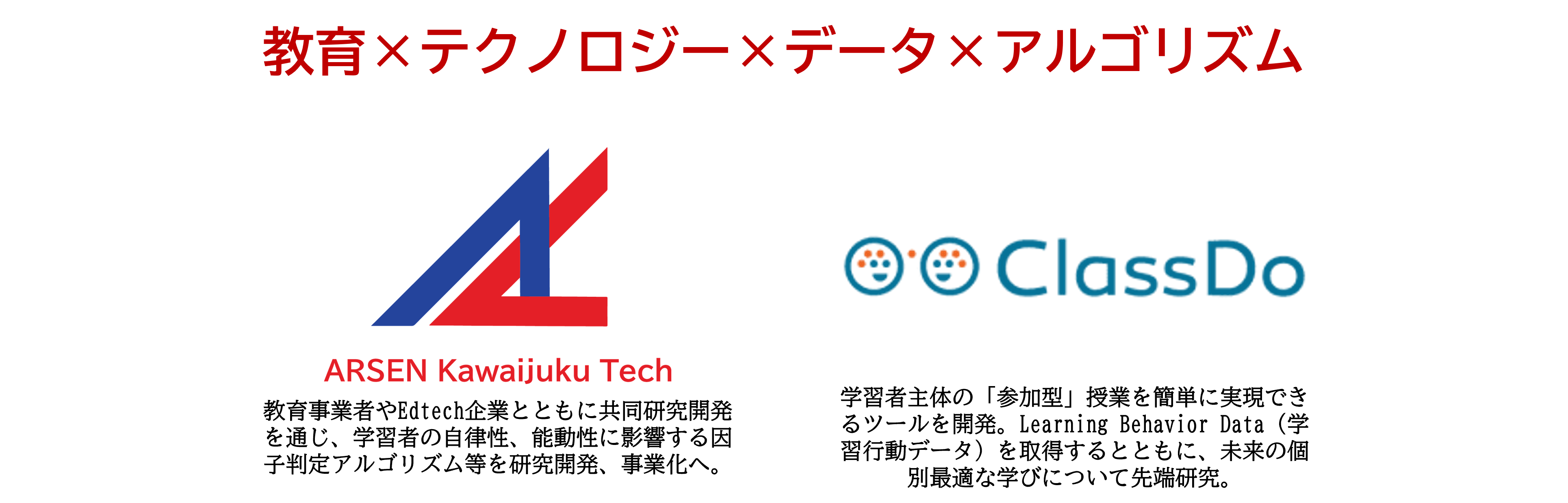 ClassDo社がそのプラットフォームを通じて保有する豊富な学習行動データをKEIアドバンスのarsenプロジェクトが分析し、学習者の非認知能力を評価分析するアルゴリズムとして開発します。このアルゴリズムを『ClassDo』サービスに応用することで、新たな学習体験の提供をめざします。例として、より学習効果の見込める指導者と生徒、もしくは生徒同士の組み合わせの実現などが想定されます。