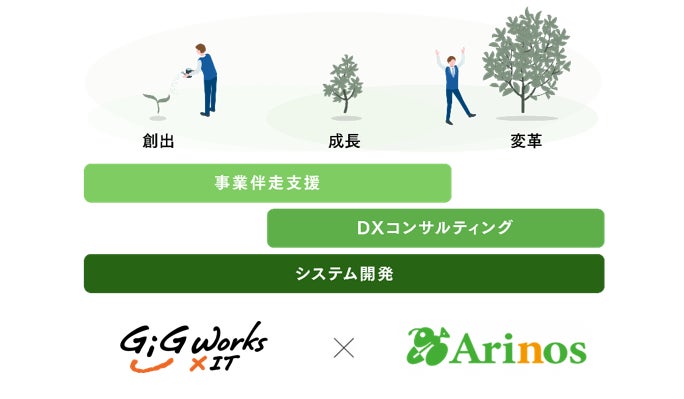 ギグワークス株式会社(本社:東京都港区、代表取締役社長:村田 峰人)のグループ会社であるギグワークスクロスアイティ株式会社(本社:東京都港区、代表取締役社長:小島 正也、以下 ギグワークスクロスアイティ)は、中小・中堅企業の経営課題の抽出からソリューション提供まで一気通貫した支援を実現することを目的とし、新規事業創出や業務改善を行う株式会社Arinos(本社:東京都中央区、代表取締役社長:古家 由也、以下 Arinos)と業務提携したことをお知らせします。