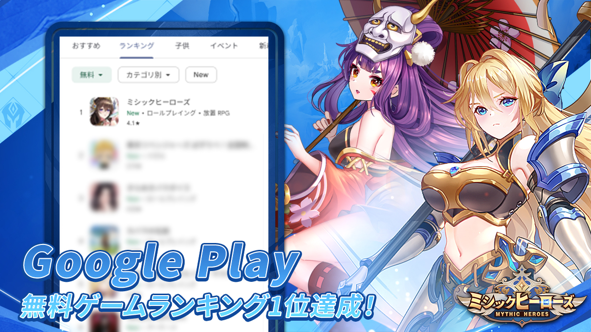 - 放置系神話RPG『ミシックヒーローズ』、GooglePlay無料ゲームランキング1位獲得!