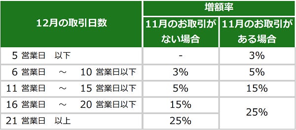 なお、11月中(11月1日 6:10~12月1日 6:55)に通貨ペア・数量を問わず1度(新規・決済)でもPFX・nanoいずれかでFX取引をされた方には、お取引日数を+5日分とカウントし、増額率3%からスタートといたしております。