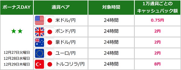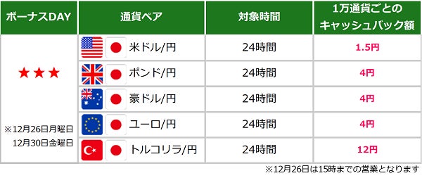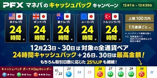 12月23日~30日の期間は、キャンペーン対象のすべての通貨ペアで24時間(メンテナンス時間を除く)キャッシュバックの対象となります。是非お取引にお役立て下さい。