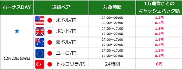 - 23日からは対象通貨ペアで24時間キャッシュバック!