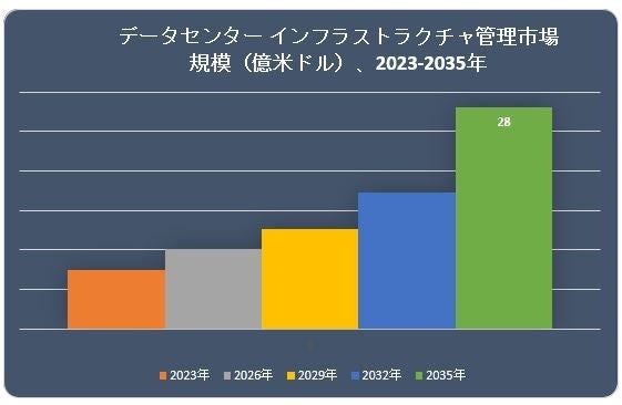 世界のデータセンター インフラストラクチャ管理市場は、2021 年に約 72 億米ドルと評価されました。また、市場は11.5% の CAGR で成長することにより、2035 年末までに 280 億米ドルの収益を獲得すると推定されています。市場の成長は、増加するインターネット プロトコル (IP) トラフィックと効果的なデータ トラフィック管理の必要性に基づいて計算されます。世界的に、コンシューマ IP トラフィックは 2017 ー2022 年の間に3 倍に増加し、25% 以上の CAGR で 1 か月あたり約 330 エクサバイトに達しました