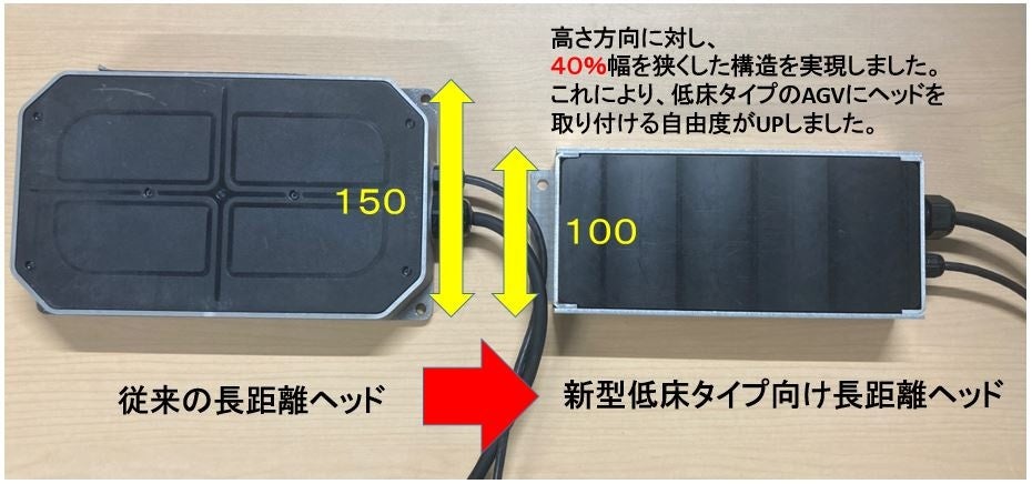 従来品の長距離ヘッドですと、低床タイプのAGVに取り付ける際、高さが150mmある為、走行時に床を擦ってしまう懸念がありました。この度リリースします低床タイプの長距離ヘッドは、高さを従来タイプより40%薄型にしたことで、低床タイプのAGVへの搭載性の自由度が大幅に向上しました。