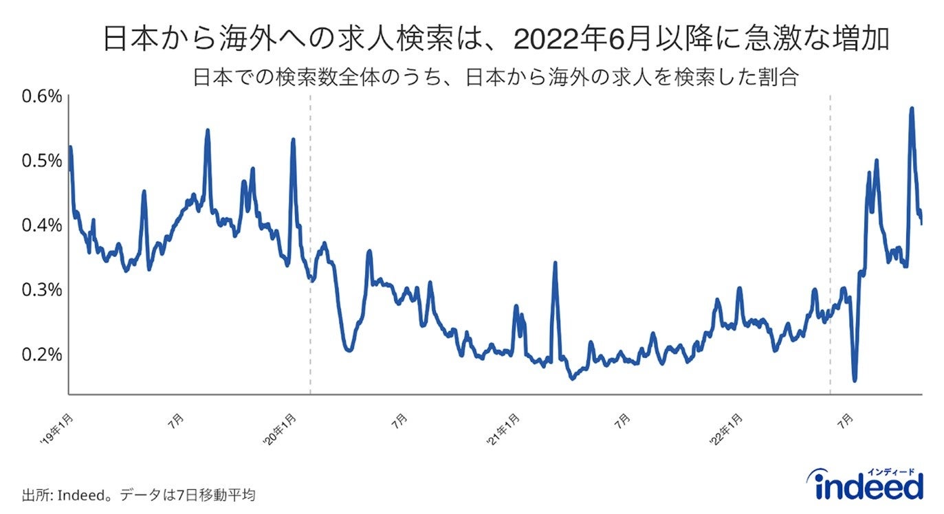 2022年6月以降は、日本の移動制限の緩和や、インフレーションによる実質賃金の低下、急激な円安の進行などに伴い、より高い給与を期待して海外での仕事を探す人も増えていると考えられます。
