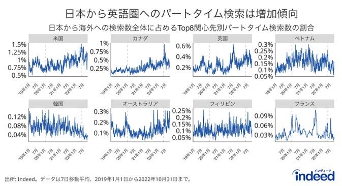 【注】本データは、2019年1月1日〜2022年10月31日における、Indeed上での日本在住者の海外求人の検索数全体に占めるTop8関心先別パートタイム検索数の割合を示したもの。波線は、パンデミック宣言時期(2020年2月1日)、1ドル130円超を最初に記録した時期(2022年6月1日)を表す。