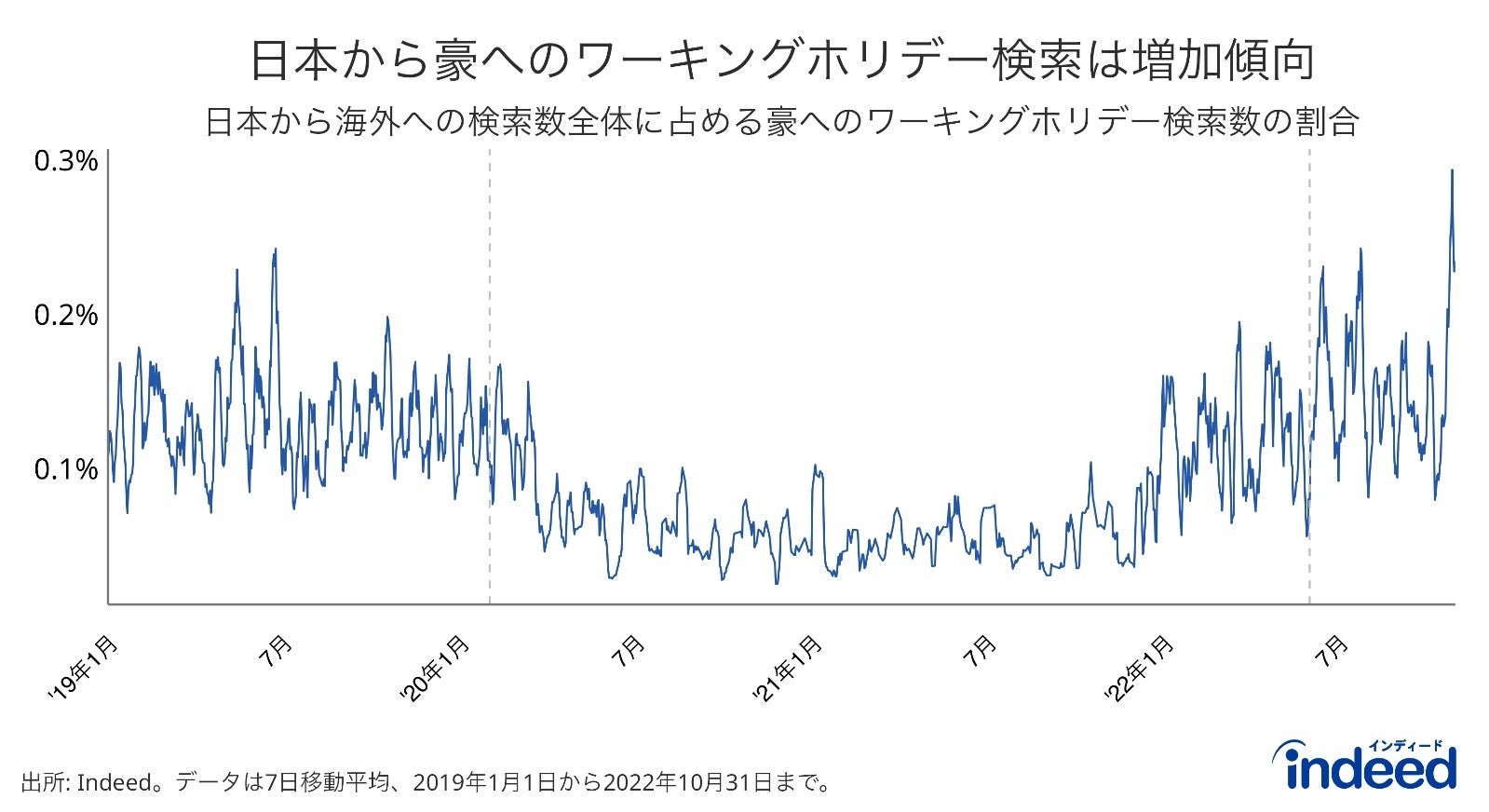 【注】本データは、2019年1月1日〜2022年10月31日における、Indeed上で日本在住者の海外求人の検索数全体に占めるオーストラリアへのワーキングホリデー検索数の割合を示したもの。波線は、パンデミック宣言時期(2020年2月1日)、1ドル130円超を最初に記録した時期(2022年6月1日)を表す。