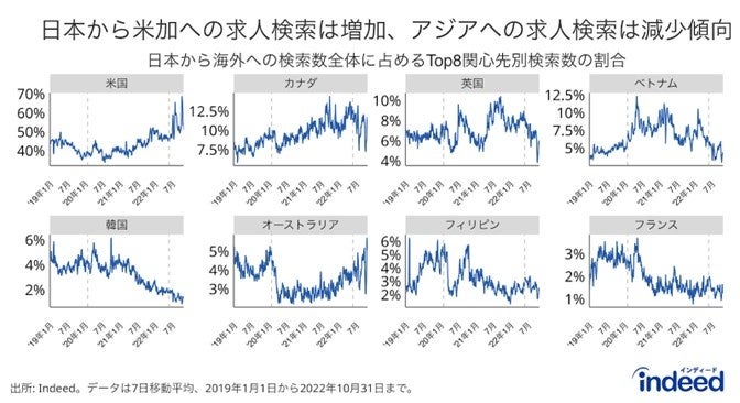 【注】本データは、2019年1月1日〜2022年10月31日の期間中における、Indeed上での日本在住者の海外求人の検索数全体に占めるTop8関心先別検索数の割合を各示したもの。波線は、パンデミック宣言時期(2020年2月1日)、1ドル130円超を最初に記録した時期(2022年6月1日)を表す。