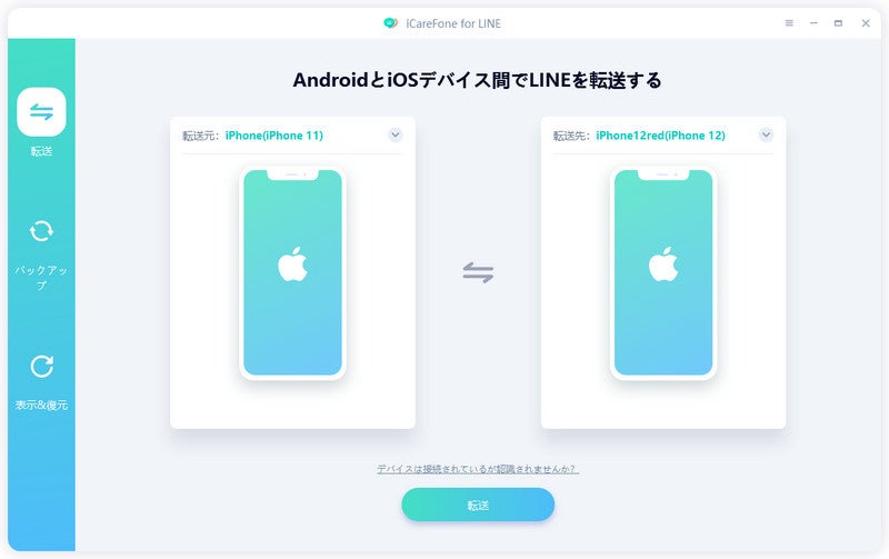 Step1:iCareFone for LINEを起動したPCに、データ移行元のiPhoneと移行先のiPhoneをUSBケーブルで接続し、デバイスが認識されたら「転送」をクリックします。