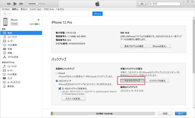 Step2:iTunesの左上に表示されるデバイスアイコン>「概要」>「今すぐバックアップ」の順にクリックして、古いiPhoneのデータをiTunesにバックアップします。