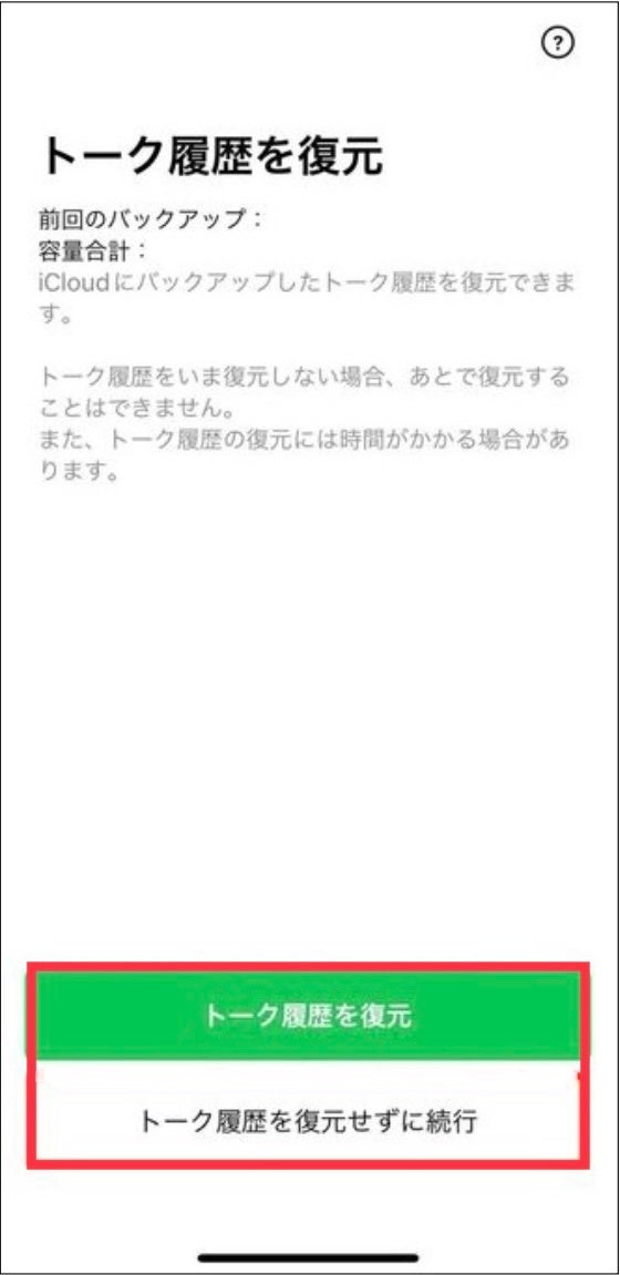 Step6:iCloudでトーク履歴のバックアップを取っている場合には、「トーク履歴を復元」を選択することで、直近14日間のトーク履歴に加えて、バックアップ分のトーク履歴を復元することが可能です。バックアップがない場合には、「トーク履歴を復元せずに続行」を選択すると、直近14日間分のトーク履歴のみ復元できます。