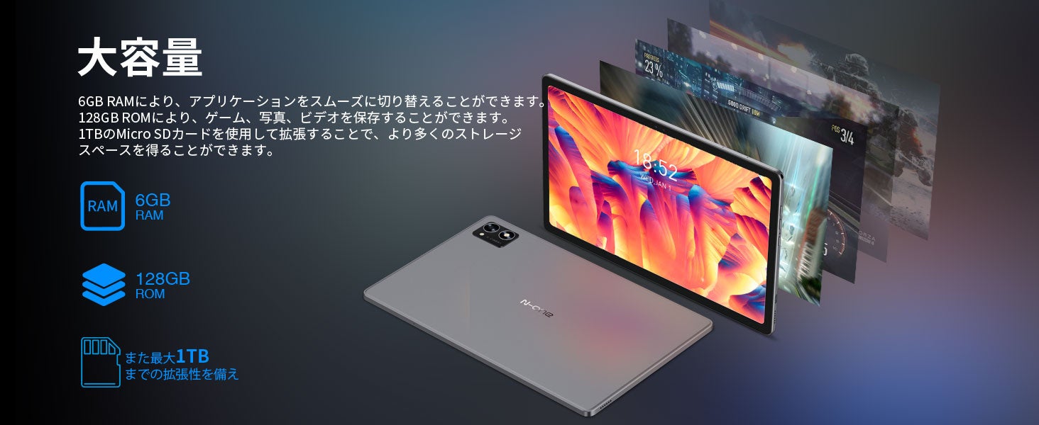 【6GBのランニングメモリと128GBの高速ストレージを搭載】ストレージに拡張可能なMicroSDをサポートしています。メモリ容量が大きいとタブレットはサクサク動くようになります。Webサイトや動画を見たり、重いアプリや高画質のゲームを楽しみいただきます。お気に入りの本、曲、写真、映画、ゲームなど、好きなものをすべてダウンロードして保存できます。容量不足に困ることなく十分にお楽しみいただきます。6000mAhの大容量バッテリーとAIインテリジェント電源管理により、7時間の映画・読書・ブラウジングを楽しむことができます。