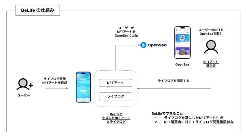 また「BeLife」を通じてNFTマーケットプレイスに出品されたNFTアートの購入ユーザーは、同じく「BeLife」サービスを利用して、作品の出品ユーザーがNFTアートに紐付けたログを閲覧する事ができます。よって「BeLife」を通じた取引においては「NFTアートの所有」+「NFTアートを構成したライフログの記録データの閲覧権利」をNFTアート購入ユーザーに提供します。
