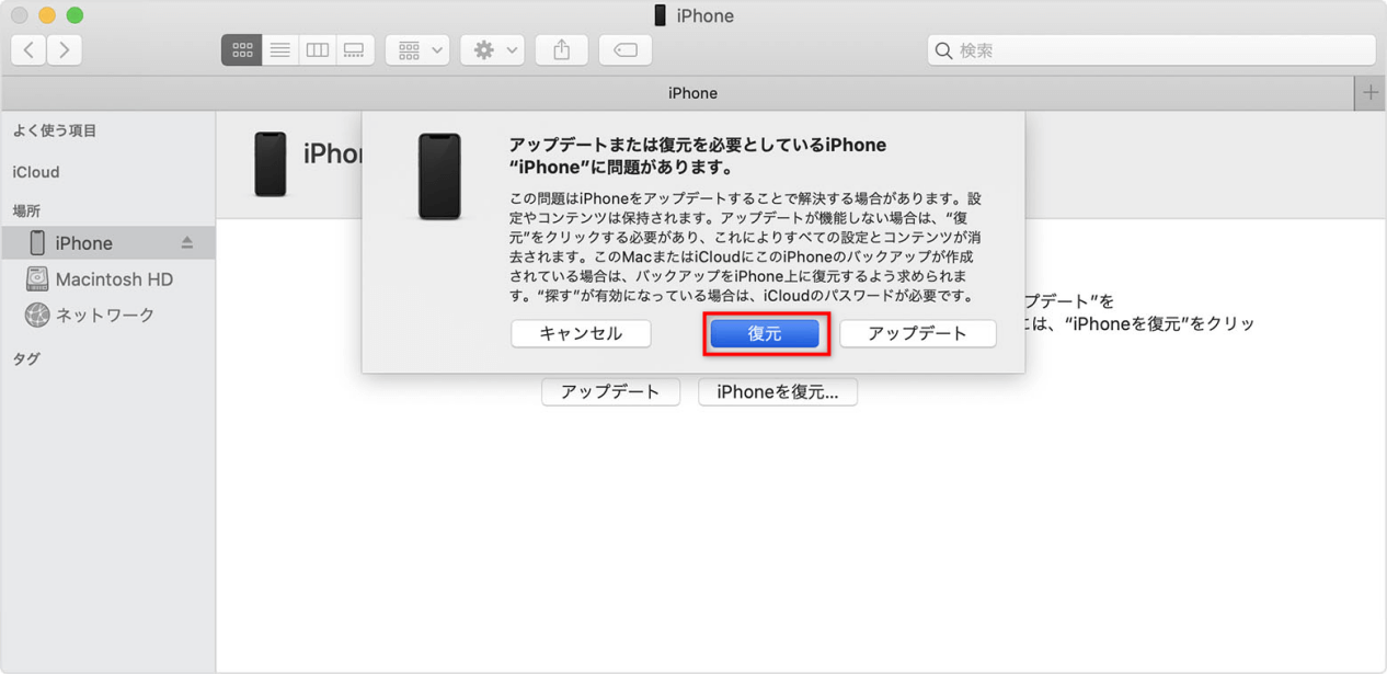 Step4、iPodが接続されているコンピュータの Finder や iTunes で、以下の画面が表示だれます。「復元」ボタンをタッチします。