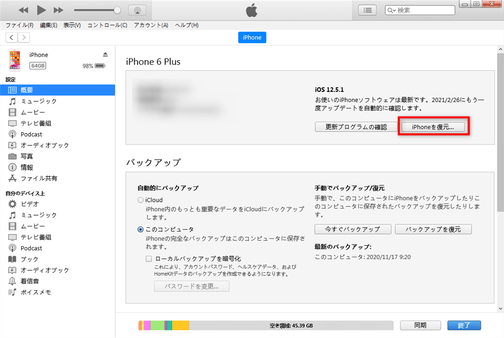 ご利用しているiPodをiTunesで同期したことがある場合は、iTunesでロックを解除することができます。以下で詳しい手順をご紹介します。