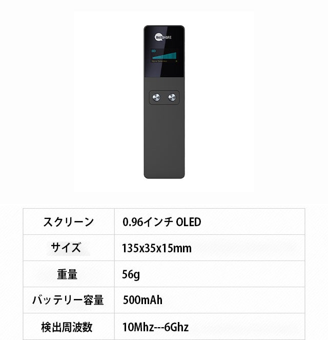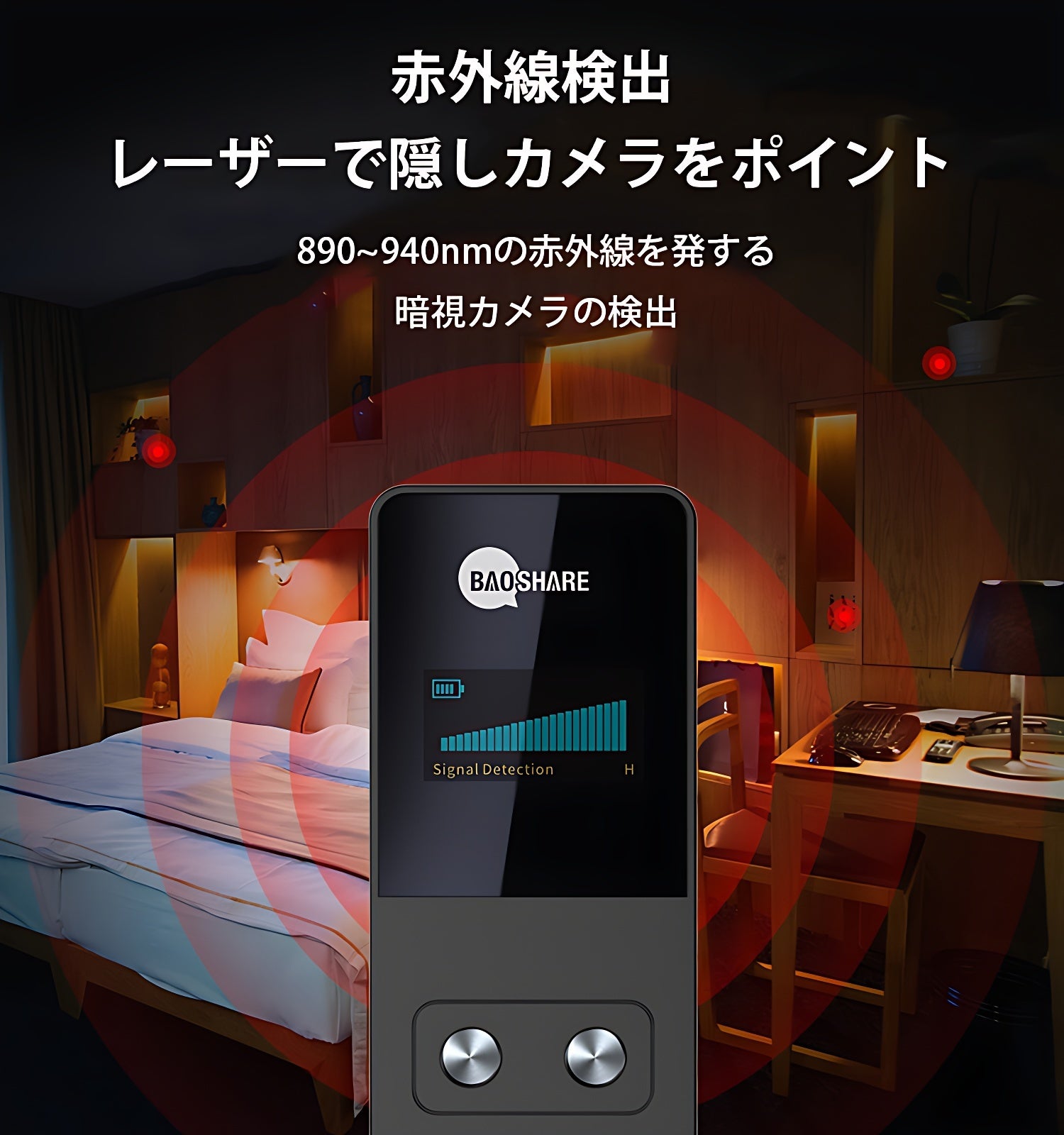 GPS、Wi-Fi、ワイヤレスWi-Fiカメラ、Webカメラ、無線盗聴器、GPSロケータ、これらの信号は全て検出可能です。