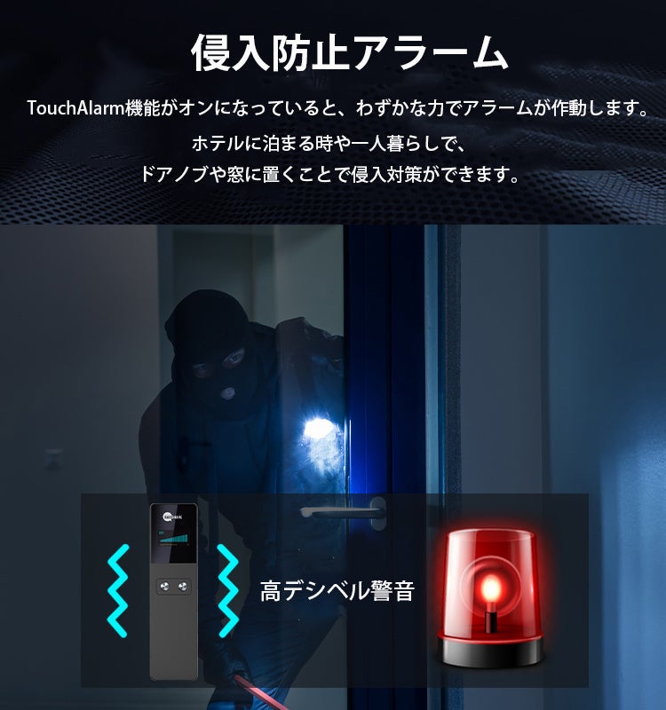 「KD60」は盗難/侵入防止アラーム機能を搭載しており、一人暮らしの方やホテルに泊まる際に非常に役立ちます。