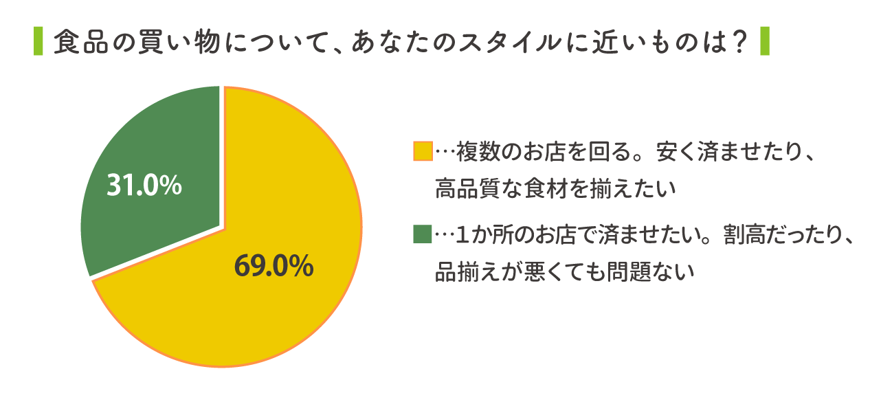 買い物のスタイルは、69.0%の方が満足する品物のために「複数のお店を回る」と回答。食品の品質や価格に妥協しない読者の姿が浮き彫りになりました。
