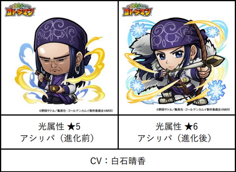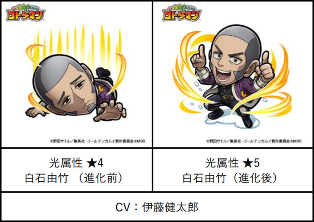 「杉元佐一」をはじめ、北の大地で杉元が出会ったアイヌの少女「アシㇼパ」、「脱獄王」の異名を持つ天才脱獄囚「白石由竹」などのキャラクターがコラボ召喚に登場します。