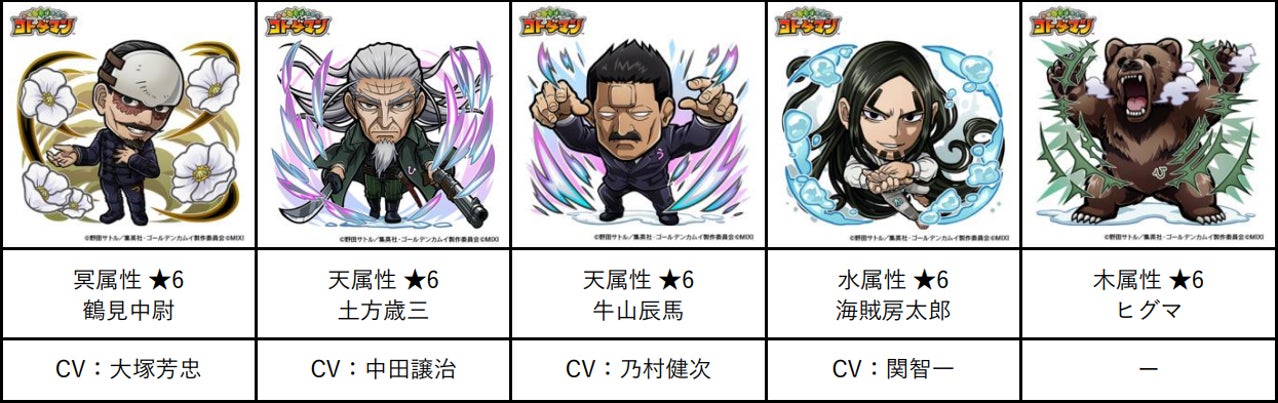 コラボクエストには「鶴見中尉」と「土方歳三」が【魔級・破滅級】、「牛山辰馬」と「海賊房太郎」が【超級】、「ヒグマ」が【上級】に登場します。
