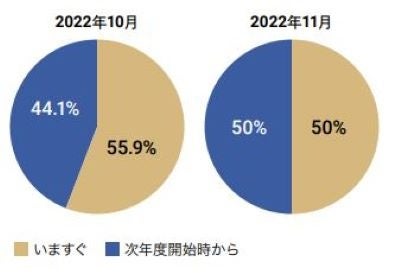 2.雇形態別で見ると2022年9〜11月では、園の募集は正社員の募集が微増。一方保育士の求人希望としては微減し、募集と希望のギャップが拡大している。 3.採用タイミングは、前月から引き続き次年度採用の比率が上昇。次年度の体制整備に向けて半数近くが 次年度に向けた採用になっている。 |