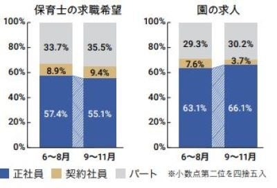 保育士バンク!の利用実績をもとに、直近3か月の保育士求職者の希望と園の募集要件で、正社員・契約社員・パートの雇用形態の割合を算出、 前期間と比較。