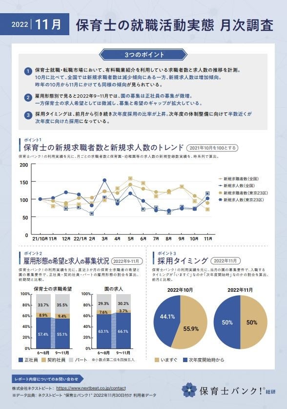 2.雇形態別で見ると2022年9〜11月では、園の募集は正社員の募集が微増。一方保育士の求人希望としては微減し、募集と希望のギャップが拡大している。 3.採用タイミングは、前月から引き続き次年度採用の比率が上昇。次年度の体制整備に向けて半数近くが 次年度に向けた採用になっている。 |