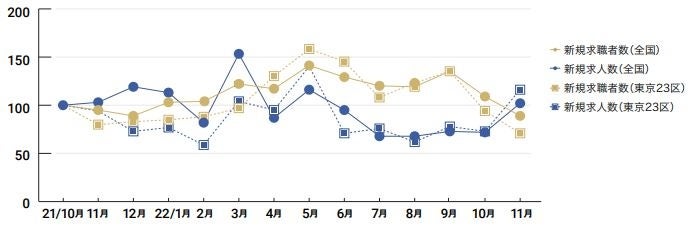 | 1.保育士就職・転職市場において、有料職業紹介を利用している求職者数と求人数の推移を計測。10月に比べて、全国では新規求職者数は減少傾向にある一方、新規求人数は増加傾向。昨年の10月から11月にかけても同様の傾向が見られている。