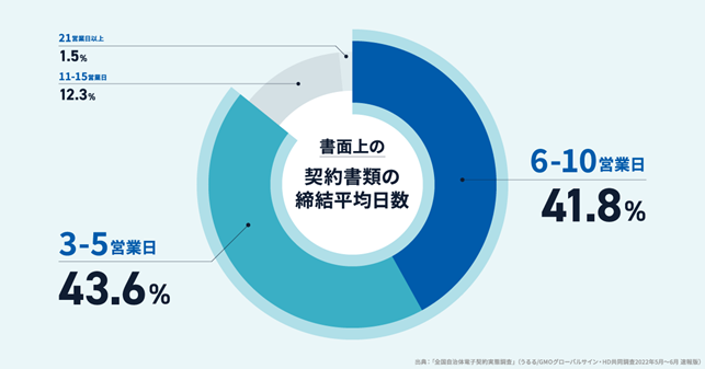 さらに、2022年1月以降から順次、近隣地域における普通郵便配達の翌日配達サービスが順次停止されたことから、従来の配達期間と比較して1~3営業日ほど配送期間が長くなったと言われています。(※1)これにより、今後は電子契約と紙の契約書の締結スピードの差は、さらに長期化していく可能性が考えられます。
