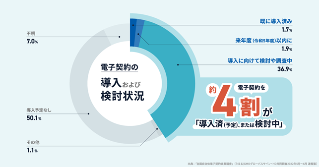 ・自治体の約4割が、電子契約システム導入に向けて具体的な調査や検討を進めているという結果に