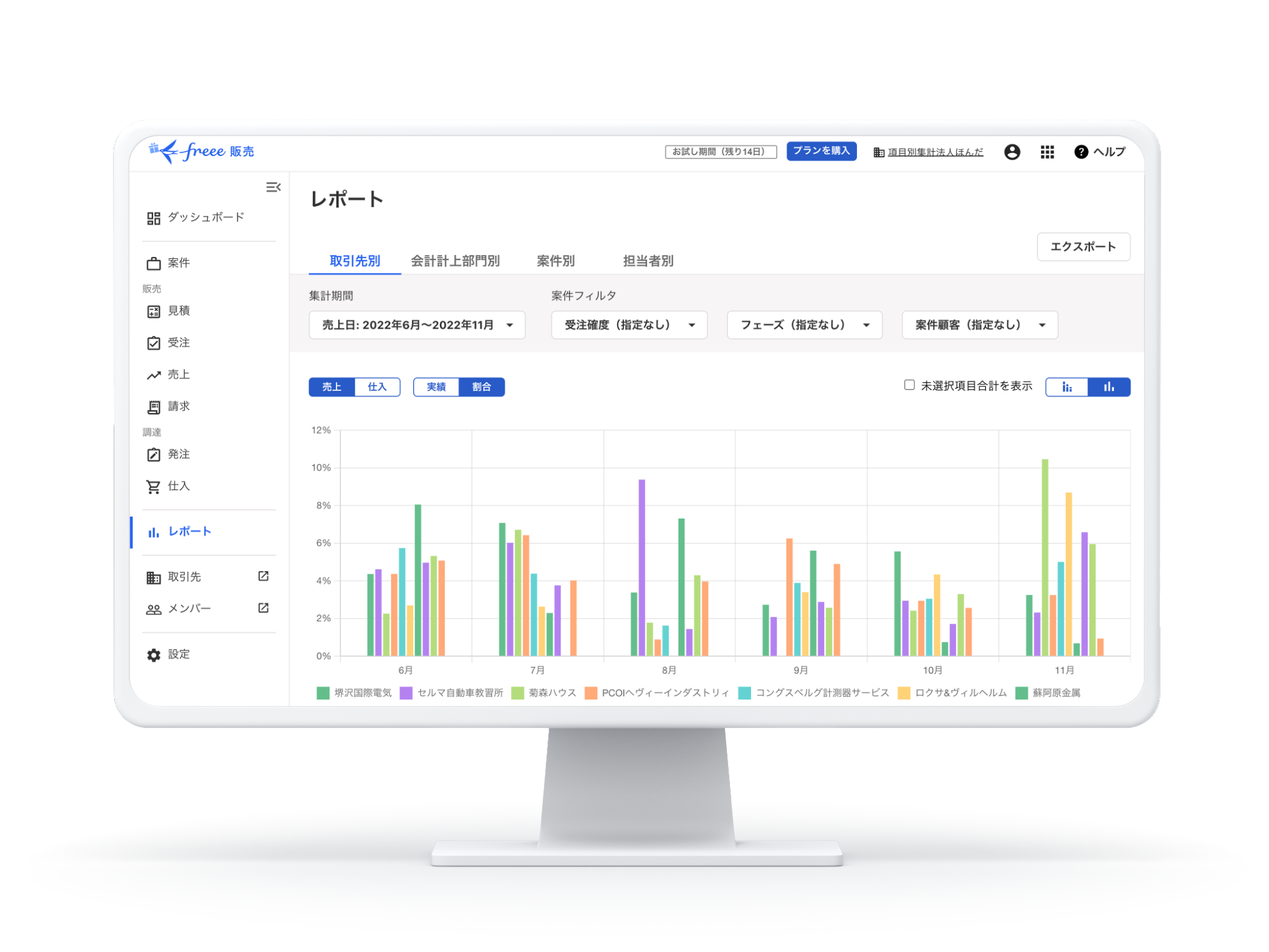まずは、取引先別・部門別・担当者別・案件別の売上/仕入の実績が分かる機能を公開。今後は、粗利の実績や売上・原価の見込みが分かる機能を段階的にリリースします。