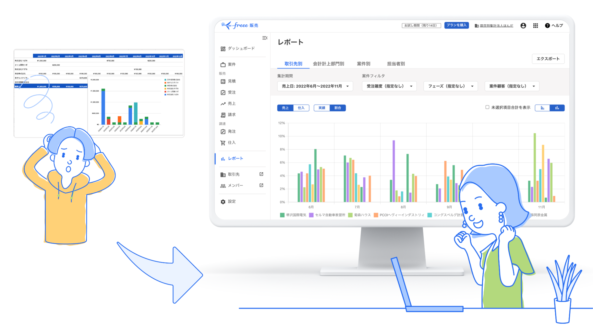 freee調べによると、販売管理を紙・Excelで行っている小規模事業者は約76%(※)存在します。販売管理ソフトを導入している場合も、発注管理・受注管理・案件管理…などそれぞれ単体のツールを利用している方が多く、情報が分断されてしまい煩雑な作業工数が発生します。また、集めたデータを集計・分析する際も複雑な関数入力やグラフ作成が必要となり、人材不足のスモールビジネスにとって負担の大きな業務でした。